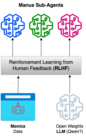 Where are the LLMs? It’s never published but each of Manus’ subagent most likely consists of a LLM post-trained with data collected from Monica, Manus team’s agentic browser plug-in. Manus’ “Less Structure, More Intelligence” motto suggest two things: